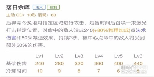 技能解析:后羿使用技能,对指定区域进行攻击,短暂时间后召唤一束激光打击指定位置,对命中的敌人造成伤害和50%减速效果,持续2秒,被中心命中的敌人会受到额外的50%伤害,二技能是后羿追击敌人和逃生时来减速敌人使用,团战中还可以区域性攻击,给敌方带来负面收益,为己方团战建立优势。