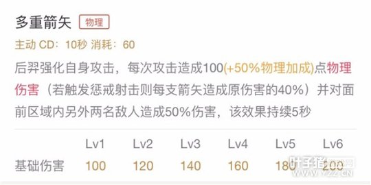 技能解析:后羿使用技能后,会强化自身的攻击,每次攻击都会造成物理伤害并对面前区域内另外两名敌人造成50%的伤害(触发被动时候伤害是40%),该效果维持五秒。一技能让后羿能够对多个英雄造成伤害,在前中期的对线上,优势更加大,保证了自己的发育。