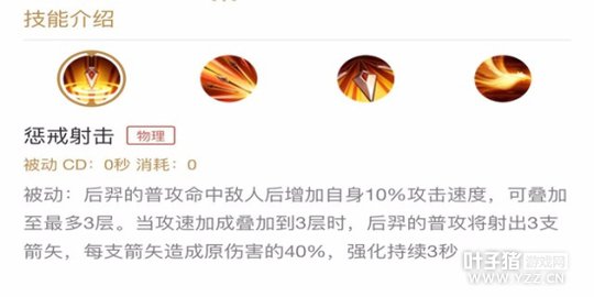 技能解析:后羿每一次普通攻击命中敌人后都会提高10%的攻击速度,可叠加三层,当被动叠加到三层时候,后羿的普通攻击会射出三只箭,每只箭造成原伤害的40%,持续三秒,被动让后羿能够一秒多箭,在团战中找到合适的输出位置,能给敌方带来致命打击。