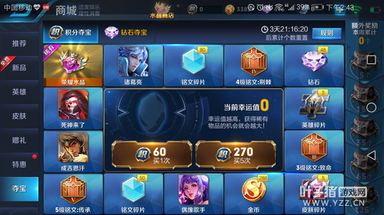 在《王者荣耀》中,玩家可以通过积分夺宝的方式来获得荣耀水晶从而兑换武则天,可以通过钻石夺宝的方式来获得王者水晶从而兑换韩信。当然积分夺宝和钻石夺宝是俩个极其看脸的活动,强烈建议下水之前洗手洗脸。