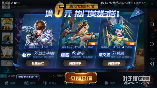 在《王者荣耀》中,玩家首次单笔满6元,即可获得热门英雄3送1的机会,包括赵云、虞姬、蔡文姬。这里强烈推荐新手朋友们选择赵云,因为游戏后期赵云只能通过点券的方式获得,而虞姬、蔡文姬依然可以通过金币购买的方式获得。