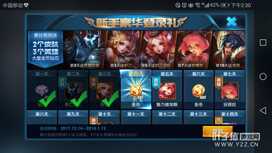 在《王者荣耀》中,玩家在注册后可以参加累计签到的活动来获取英雄妲己、安琪拉、项羽。第3天送妲己,第7天送安琪拉,第10天送项羽。除此之外,第2天送亚瑟皮肤——死亡骑士,第5天送妲己皮肤——魅力维加斯,是绝对不容错过的福利,