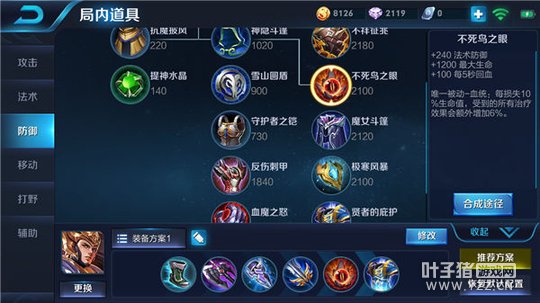 不死鸟之眼:因为版本的更新,不死鸟之眼似乎比魔女斗篷更加适合杨戬,不死鸟自身对于回复效果的加成对于杨戬来说十分重要,强烈推荐不死鸟之眼代替魔女斗篷。