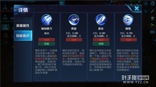 一技能-燕返:橘右京向后方跳跃,同时向指定方向挥刀造成物理伤害,若命中敌方英雄则会减少此技能冷却时间。
