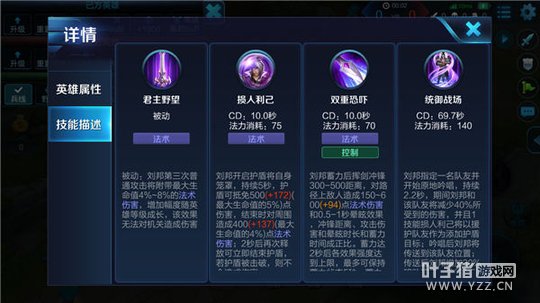 三技能-统御战场:刘邦可选择一名队友,原地吟唱,期间该队友与刘邦减少受到的伤害,并且一技能将以队友作为目标,吟唱过后刘邦传送到队友身边,并且自身增加移速和获得一个法术场,法术场为队友增加物理和魔法防御。