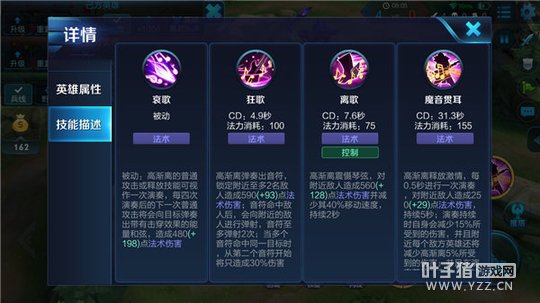一技能-狂歌:高渐离对附近敌人(至多两名)造成法术伤害,在音符击中敌人后,将向附近的敌人进行弹射(至多弹射两次),如果敌人被多个音符命中,后续的音符只会造成较少伤害。