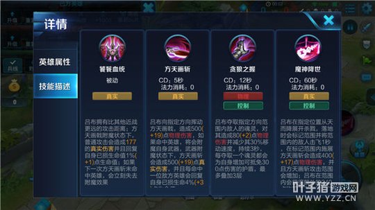 被动-饕餮血统:吕布拥有较远的攻击距离,在方天化戬附魔状态下,吕布的普攻会造成真实伤害,并能回复自身生命值,在附魔状态下,若下一次的一技能未能命中目标,会立刻失去附魔效果。