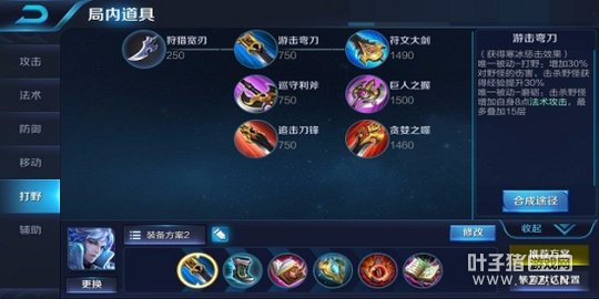 打野装备既可以提升对野怪的伤害、击杀野怪的经验,游击弯刀还可以增加诸葛亮的法术强度。不建议升级为符文大剑,因为诸葛亮在团战时一般不利用普攻打伤害,所以触发符文大剑的机会较少,而且升级还浪费前期的经济。