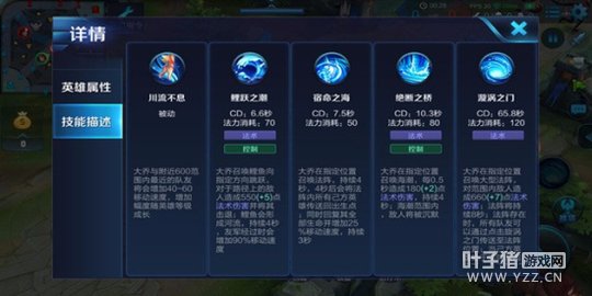 大乔召唤鲤鱼向指定方向冲击,对路径敌人造成伤害及击飞效果,期间路径会形成加速带友方经过会提升移速,大乔能利用一技能抵御敌人的正面突进,打断其位移技能,也能利用一技能的加速效果让队友快速到达线上,支援,迅速脱离敌方攻击范围,该技能的伤害及加成都不错,出一两件法术攻击装备就能让辅助也能有不错的伤害能力。