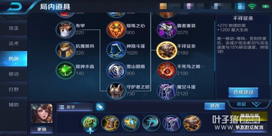 最后一件装备选择更为多样,提升物理防御选择不祥征兆(不与极寒风暴冲突有更好的减速效果)或反伤刺甲(抵御爆发物理伤害,普攻也会占据输出),贤者的庇护削弱之后(只能复活两次)依旧可以出,失去被动后可选择其他装备。