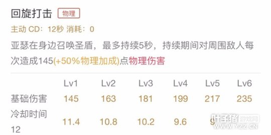 技能解析:亚瑟使用二技能以后,周围出现圣盾,最多持续5秒,持续期间对周围敌人每次造成物理伤害,该技能能够进行持续消耗作战,在线上对线时候,能够保证快速清理兵线,配合被动能够对敌方进行消耗,压制其发育,让其回家补给,一点一点将塔磨掉。