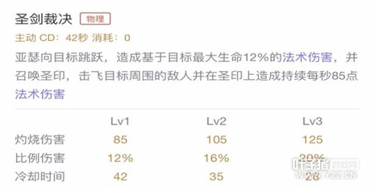 技能解析:亚瑟向目标跳跃,造成基于目标最大生命12%的法术伤害,并召唤圣印,击飞目标周围的敌人并在圣印上造成持续每秒法术伤害,三技能对于残血具有很强的收割能力,还可以用来先手开团,给敌方带来压力,团战打完一套就后撤等待被动回复,再进入战场作战。