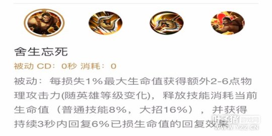 整体分析 : 这个被动技能让别人不敢小看残血的程咬金,程咬金在低血量的状态下,会获得额外物理攻击力的提升,因此程咬金在低血量时的输出能力是相当可怕的。另外,程咬金在释放技能的时候会消耗自己的生命值,并且还会回复一部分的生命值。