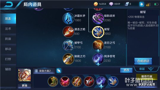 破军是王者峡谷中物理加成最高的装备,但所需金钱也较多,因此在最后购买。破军将黄忠的输出能力最大化,提供了黄忠巨额的物理攻击力,对于黄忠的物理输出能力有很大的提升。且其被动技能加强了黄忠对于残血英雄的伤害,一定程度上提升了收割能力。