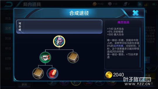 痛苦面具:痛苦面具本身拥有一定的法术攻击、法术穿透、冷却缩减和最大生命加成,其唯一被动折磨还能够有效提升干将莫邪的单次技能伤害,非常符合干将莫邪的输出机制。