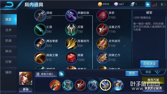 解析:破军这件攻装有着非常高的攻击加成,不仅提升李白高额的伤害,被动也能使李白在敌人血量低于一半时可以获得额外的伤害提升,在经济压制的情况下一个大招就能够秒掉敌人。