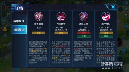 三技能-魔神降世:吕布在指定位置从天而降展开杀戮,在落地的时候会标记一个范围并击飞范围内的敌人,在标记范围内释放方天画斩的攻击范围会增加。在范围内吕布可以获得较高的物理和法术防御加成,因此落地后最好在范围内作战。当敌方英雄触碰到范围边缘时,会受到较高的减速效果并能恢复吕布自身的生命值,因此也可以很好的用来留人或者切割战场。因为释放该技能时能进行较远的位移,所以在关键时刻也可以当作逃跑技能使用。