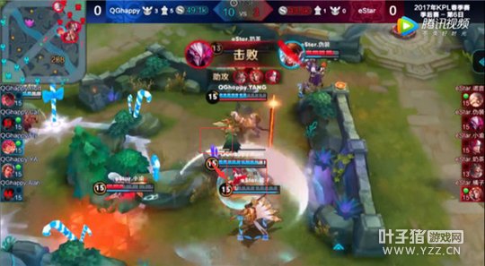 双方在野区爆发了一波团战,红色方杨戬用一技能突进到赵云身边成功配合队友将其击杀后想撤退,这时候吕布迅速释放一技能,接着使用闪现突进到杨戬身前,成功将其击杀。