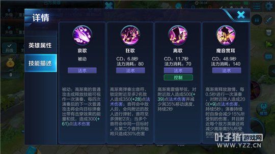 三技能-魔音贯耳:高渐离开始演奏,对周围的敌人持续造成伤害,演奏期间周围的敌方英雄数量越多伤害减免越高;开启该技能时,高渐离会获得爆发性移速加成,但随着时间移速加成会衰减。
