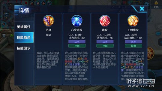 一技能——六令追凶:一技能是狄仁杰的范围输出技能,并且在造成伤害的同时,还能打出减速效果,提高了狄仁杰的战场击杀能力。