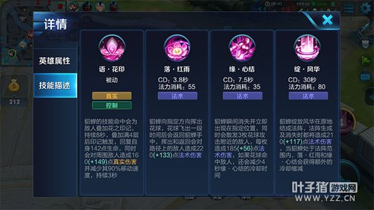 被动-语·花印:技能命中敌人之后可以叠加印记,叠满四层之后就可以触发印记,回复生命值的同时还会造成范围的真实伤害,这个技能是貂蝉最关键的技能,依靠被动,貂蝉不需要太多的输出装备也能打出很高的伤害,团战中敌人走位比较集中的话,被动可以打出非常高的真实伤害。