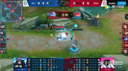 比赛进行到五分多钟的时候,双方在野区爆发了一波小团战,但这时候蓝色方人数不齐,红色方在人数上占了优势。诸葛亮在团战爆发后并没有选择马上参团作战,而是先站在战场的边缘用一技能打消耗并叠加谋略刻印,先是蓝色方的貂蝉开启了大招,接着张飞释放完大招,然后诸葛亮才进入到团战中心,用一、二技能打出伤害,在队友的配合下成功击杀了貂蝉,蓝色方只好选择撤退。