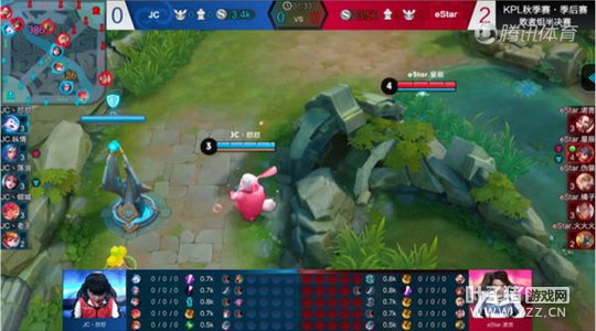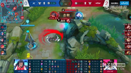 开局后,双方都没有选择反野,而是各自打各自的野区。李元芳凭着一技能的优势,清野速度明显快于橘右京,在清完下野区后迅速清上野区,先打蓝BUFF的他保证了自己在接下来的清野过程中有充足的蓝量。