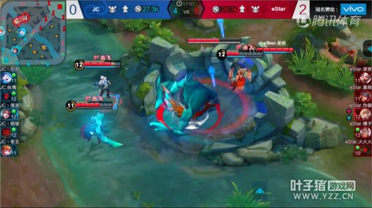 比赛进行到了十一分钟,这时候蓝色方两人还在复活中,红色方果断选择攻打主宰,李元芳则站在靠近红BUFF处,利用自己较远的普攻距离安全打主宰,利用自己的一技能、普攻以及大招快速帮队友拿主宰。