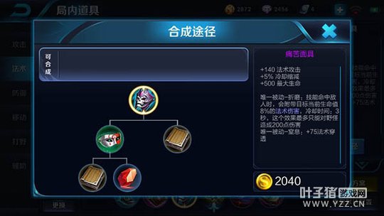 分析:前中期的高渐离想要打出高额的输出伤害,我们首推做出痛苦面具。此装备一方面能提高高渐离的技能释放频率、法术穿透、最大生命和法术攻击,另一方面装备的折磨被动让他的技能可以打出附带目标当前生命百分比的法术伤害,确保高渐离能够轻松输出敌方前排。而博学者之怒更多的是提高高渐离中后期的法术攻击属性,让他的法术攻击属性得到本质上的提升,确保可以打出爆发伤害。