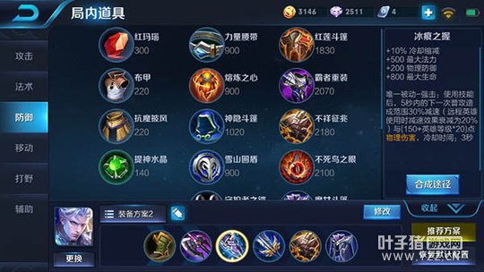 分析:后期的装备选择,我们更倾向于防御装。不祥征兆能够让铠不再惧怕敌方刺客或者具有风筝能力的射手,因为此装备的寒铁被动能够减少攻击者的移速和攻速,能直接压制其输出火力。而魔女斗篷更多的是提高铠应对敌方法师的能力,此装备能为铠提供一个可以吸收法术伤害的护盾,帮助他不会被敌方法师过多的消耗。