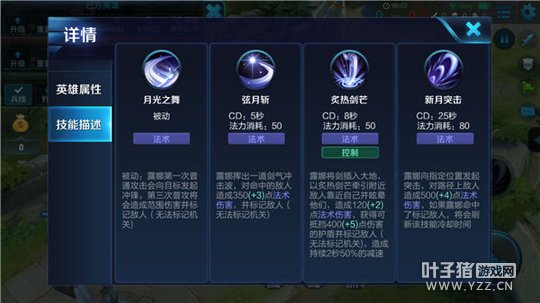 弦月斩(一技能):露娜向前挥动剑锋,对命中目标造成物理伤害的同时也可以标记目标,是露娜追踪残血与消耗敌方技能时的强大助力。