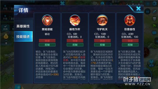 一技能-狂意杀戮:张飞对周围敌人造成物理伤害,命中敌方英雄时可造成击退效果,每命中一个非英雄单位增加能量值,命中敌方英雄将获得额外能量值;变身后的张飞向指定范围内敌人造成物理伤害。