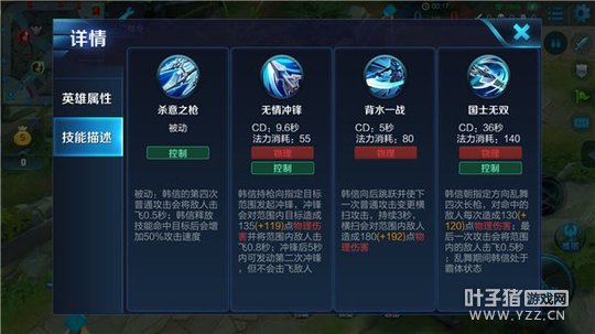 被动技能-杀意之枪:韩信的第四次普攻会将敌人击飞,增强了韩信的控制能力,把握时机可以用来中断敌方英雄的技能,也可以用其他技能衔接释放,打出更持续的控制效果。在技能命中目标后,韩信的攻速还会有短暂的提升,能让他更快的触发击飞效果,也能让他更快的清野、清线和推塔。