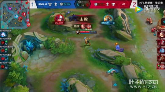 比赛进行到九分多钟的时候,双方在下路爆发了一波小团战,而韩信在该次小团战中表现非常优秀。双方先是3V3,韩信见铠开大入场,并且李白要进场刷大的时候,果断释放二技能先撤出大招的攻击范围,躲过了一波伤害。在队友将释放完大招的李白击杀后,韩信又返回战场,利用一技能将铠挑飞,帮助了大残的老夫子成功逃跑。这时候中路的诸葛亮已经赶来支援,韩信见队友在追击铠,于是便选择追击逃往另一方向的鬼谷子,并成功将其击杀。