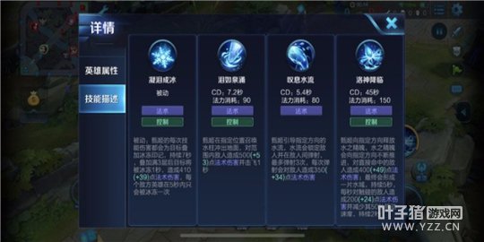 解析: 甄姬向指定的位置释放水之精魄,该精魄会进行推进,当触碰到敌方目标或者推进到最大距离时,精魄会形成一片持续5秒时间的水域。水域会对触碰到的敌人造成法术伤害与减速效果。