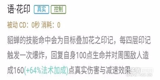 技能解析:貂蝉被动的回血在前期对线时能够大胆的与敌方中单换血,大大增强了貂蝉的续航能力。爆炸触发的范围性真实伤害在团战中的作用无疑是巨大的,并且因为造成的伤害是真实伤害,所以不管是敌方前排还是后排,貂蝉都能进行有效的输出。最后的减速效果,不管是用来追杀还是逃跑都是非常有用的。