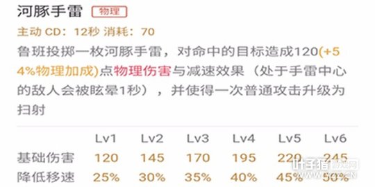 整体分析:鲁班七号向指定位置投掷河豚手雷,对命中的目标造成伤害并减速,使用手雷后的下次普攻变更为扫射。该技能最大的优点在于其后期CD较短,可以凭借这个,在团战中打出多次被动效果和减速效果。