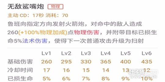 数值分析:基础伤害:260(+100%物理加成),附带法术伤害:目标已损生命的5%。该技能是全图技能,可以用来抢龙,混助攻等等,其技能成长带来的效益高于一技能,该技能升到6级后大大提高了鲁班七号的远程收割能力,建议主加。