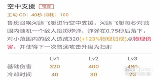整体分析:鲁班七号召唤河豚飞艇向指定方向飞行,对范围内敌人随机投掷炸弹,炸弹落下对小范围内敌人造成物理伤害,使用技能后的下次普攻变更为扫射。该技能中后期效果明显,可以大大提高团战胜率,巧妙运用可以很好的分割战场,让敌人手足无措。