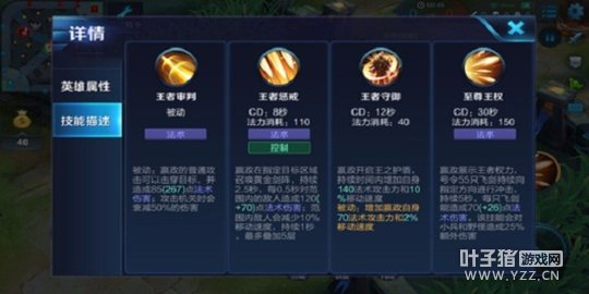 解析:嬴政开启护盾,持续时间内增加自身一定法术攻击力和10%的移动速度。嬴政没有位移技能,二技能就是其保命技能。开启后可以选择追击残血敌方英雄,,提高了平A和技能伤害,也可以借助增加的移动速度快速撤离战场。