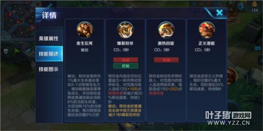 解析:血量越低攻击越高的被动,让程咬金在血量较低的状态下拥有很高的攻击力,配合上大招的恢复效果,控制好血量,能够让程咬金能扛能打。技能释放会损失血量的被动看似鸡肋但通过不死鸟之眼装备的被动加成,能够让程咬金额外的恢复血量。