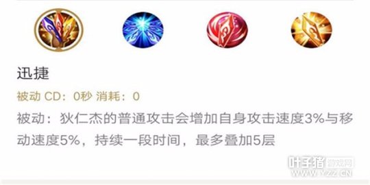 普通攻击可以增加狄仁杰的攻速和移速,最高叠加五层。被动大大提高了狄仁杰的机动性,是狄仁杰无限走砍输出的前提。狄仁杰的被动配合蓝牌的减速效果可以风筝对手,保证自己在安全的环境下稳定输出。