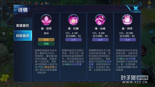 被动技能提高了貂蝉的输出伤害,让她的技能在命中敌人后可以叠加花之印记。而当印记叠满四层后就会触发以下效果:1、回复貂蝉一定的生命值,这使得貂蝉在法力值充足的情况下,就可以利用技能叠加印记提高自身续航;2、对周围敌人的造成法术加成的真实伤害,这使得貂蝉的输出伤害可以威胁到敌方的每个英雄;3、对周围的敌人造成减速效果,这能提高貂蝉的留人手段,进而增加她的技能命中率。