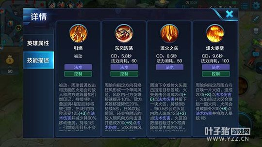 周瑜向指定范围召唤火焰,造成法术伤害,火焰会对火区的敌人造成额外的伤害和眩晕。三技能单独使用并不能造成高额的伤害和眩晕效果,需要配合火区,朝火区内释放达到技能效果的最大化,打出高额的范围爆发伤害,外加团控效果。不管是在对线还是团战中,一套爆发再加上火区的持续伤害,可以秒杀敌方后排。另外,三技能的冷却时间较短,可以频繁释放。