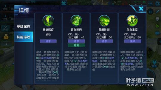 二技能-善恶诊断:扁鹊释放药剂,对命中目标持续造成法术伤害,并对触碰的友军施加恢复印记并回复生命值。