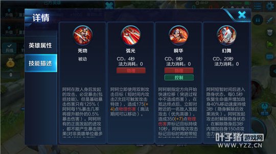 被动-死吻:阿轲在敌人背后发起攻击必定暴击(包括技能),被动特殊机制提供阿轲基础暴击伤害,每次增加暴击几率会提升额外的暴击伤害,阿轲所有正面发起的攻击都不能造成暴击效果。