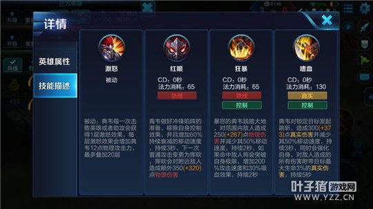 被动-激怒:典韦每一次击败英雄或者助攻都会获得一层激怒效果,每层激怒效果增加物理攻击力,但有叠加上限。