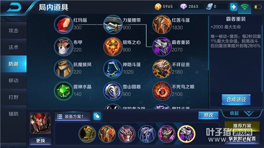 六神装:影忍之足+红莲斗篷+反伤刺甲+魔女斗篷+暴烈之甲+霸者重装