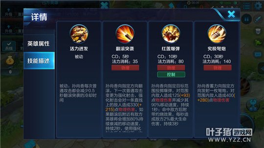 一技能-翻滚突袭:孙尚香向指定方向翻滚,强化下一次普攻能造成额外伤害和直线贯穿效果,打出强化射击的效果后,下一次普攻的射程会提高。这是孙尚香的核心技能,位移输出于一体的效果让其调整自身站位的同时还能打出强力的爆发。此外,该技能的释放后,旁边若有敌方英雄会有短暂的爆发移速加成。