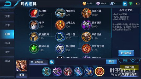 解析:到了后期,破军的选择大大加强了杨戬的收割能力,对于伤害的提升是非常可观的。带来物理攻击的同时,被动-破军将会对残血的敌人造成致命打击,十分霸道。而不死鸟之眼,增加了法术防御,最大生命和每秒回血的同时,被动-血统还能配合杨戬大招,提升回血效果。提高了杨戬的团战生存能力。
